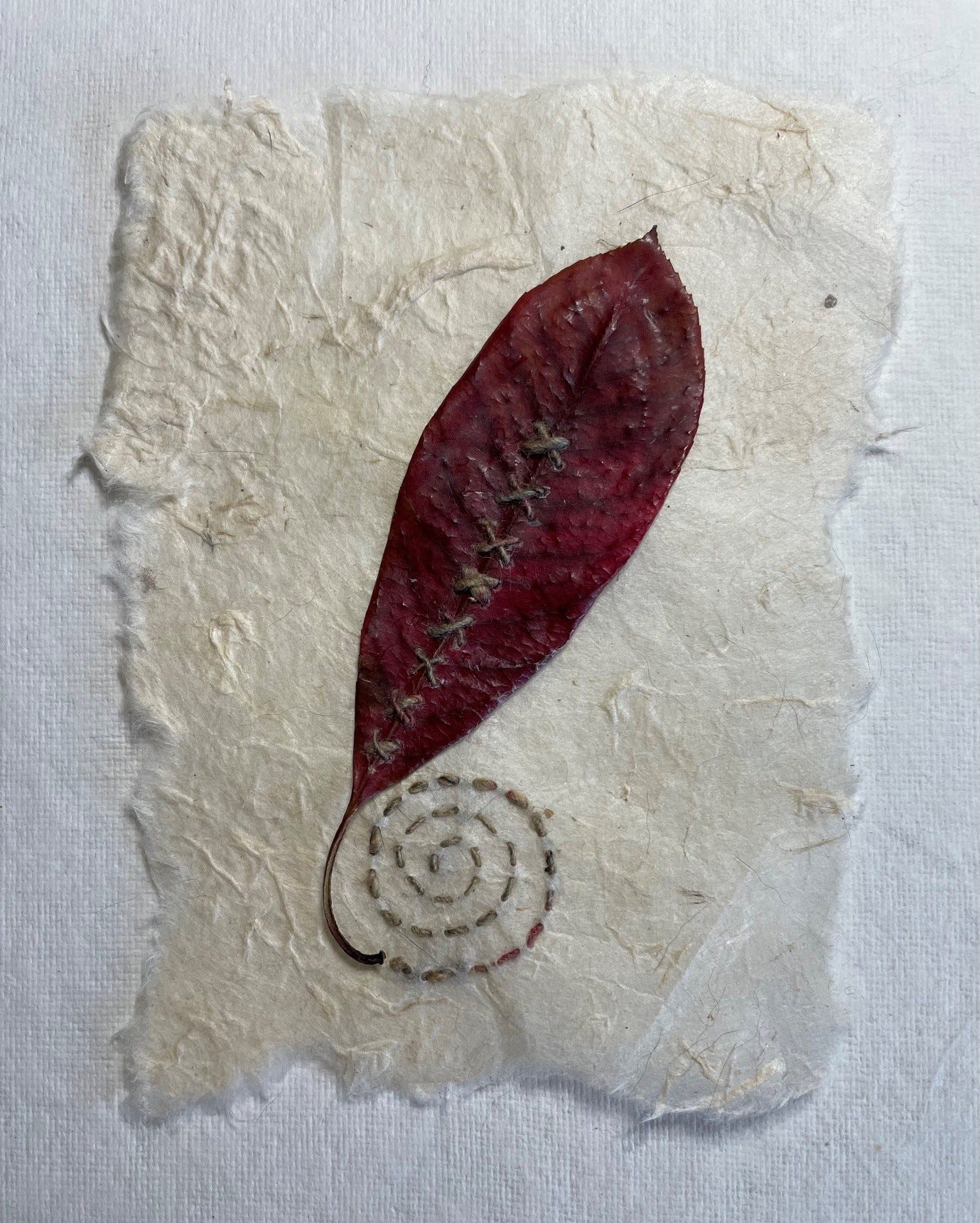 Germaine writes: ‘The Red Robin tree in our garden sheds red leaves throughout the year. I wanted to experiment with sewing one onto paper, so I decided to use cross stitches as this symbol can represent all the things that I can’t do and have to cross out of my life (the leaf being held to the paper like I so often feel held to my bed) as well as being kisses of love and hope. The stem of the leaf leant itself to being extended into the spiral shape - indicating potential creativity and pathways, perhaps invisible at first but being mapped out by the running stitches.’