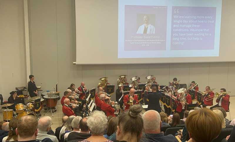 Helen’s daughter, Liz, presented the concert (brilliantly) and walked the audience through the lived experience of people with M.E. and the history regarding why it has been ignored and underfunded for decades. In the second half, the focus was on generating hope for people with M.E. through research. It was moving to see red leaves everywhere and some of the words of leading M.E. researchers projected onto the screen, while the beautiful music created a gentle and reflective atmosphere, allowing the audience to quietly absorb the messages of hope. There were some poignant moments during the concert, especially when Ken performed the flugel part in Karl Jenkins’ Benedictus, an emotionally stirring piece from The Armed Man: A Mass for Peace.