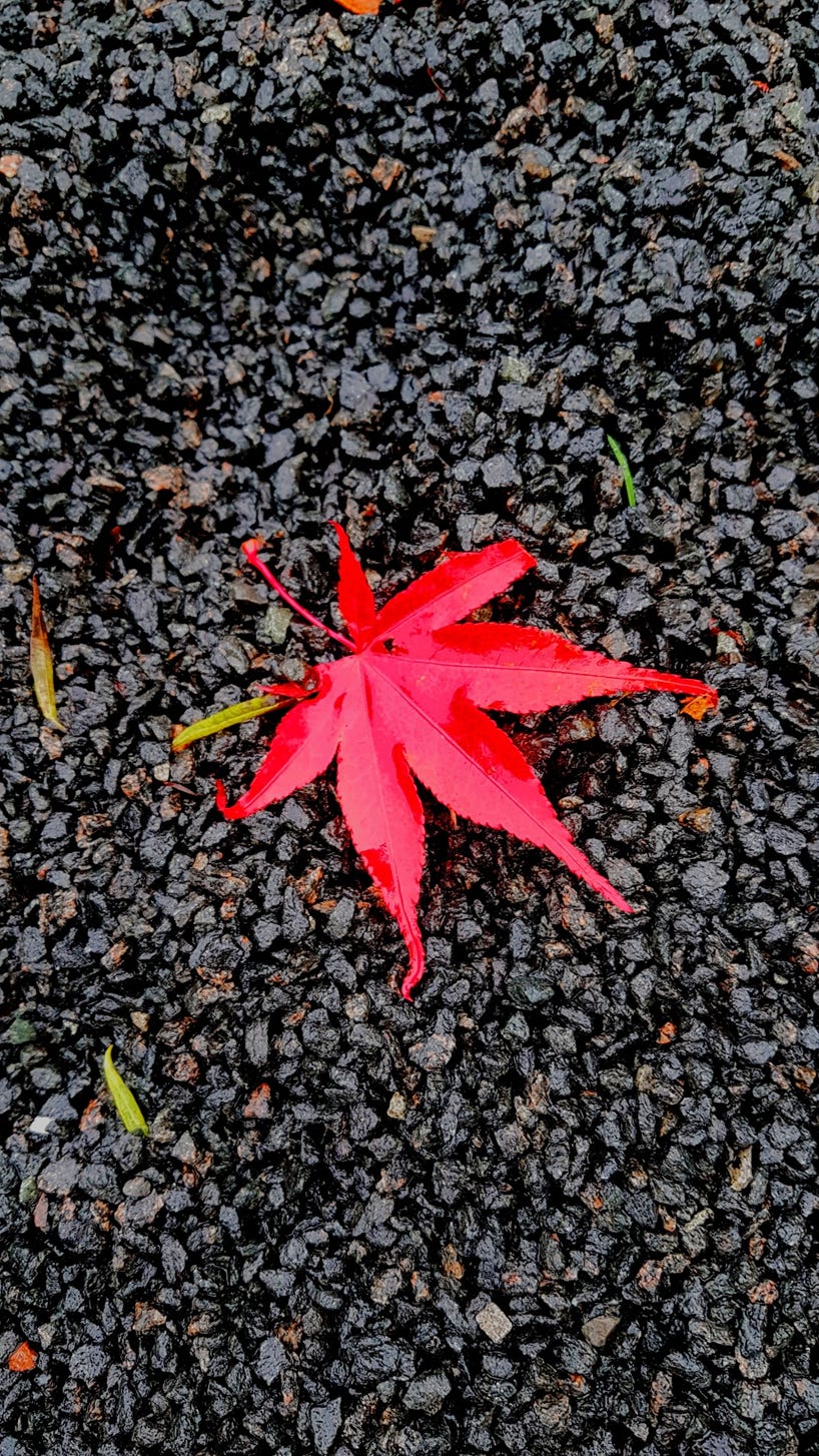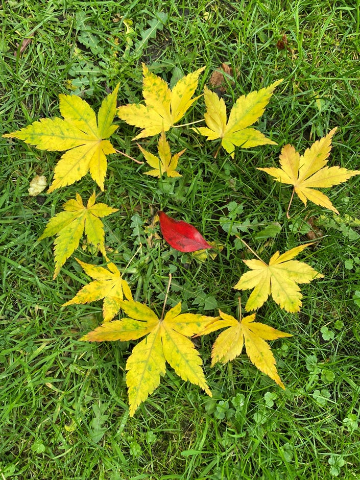 Beren writes: ‘I have had Long Covid since 2020 and I’m sometimes able to sit/lie in my garden at lunchtime, though POTS symptoms make it a challenge! This autumn, October was very warm and the grass began to grow again after going dormant in September. I noticed some yellow leaves from the acer tree in the grass and arranged them around a single red leaf that blew down from the nearby olive.’