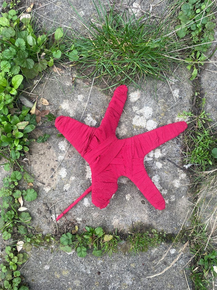 Alison writes: ‘When I saw the project was inviting contributions I just had this idea to create a leaf using some sort of frame and wrapping with red material. I had already been thinking about how I might use the metal for a creative project and found that with a bit of effort I could manipulate it into shape by hand, keeping it simple to do. As I wrapped the yarn, which had also been waiting for a use, around the frame, I realised the feel and look was like that of wrapping a bandage. I thought about how bandages are an aid to healing, and though they won’t heal ME, that it felt like I was wrapping up hope for a cure into my ‘leaf’. I chose to take the photographs outside on my patio, which has been left to go wild this year, as I have been too unwell to garden. I have been learning to appreciate the beauty in allowing life to flow as it is rather than get stuck in the losses.’