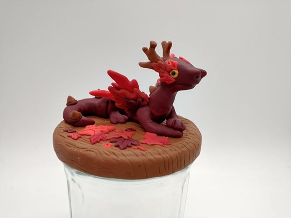 Jamie writes: ‘I wanted to add an interactive element to my figurines, and was inspired by the idea of a dragon’s hoard to create treasure jars with tiny clay guardians on top.’