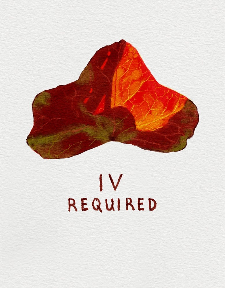 Paula writes: ‘The veins of this ivy leaf in senescence reminded me of how people with ME can easily become dehydrated, especially when feeding problems are present. IV saline can often make people with ME feel better, because it helps to increase blood volume. Unfortunately, we don’t have access to it on the NHS. IV is a homophone with ivy, of course, making for a suitable metaphor.’