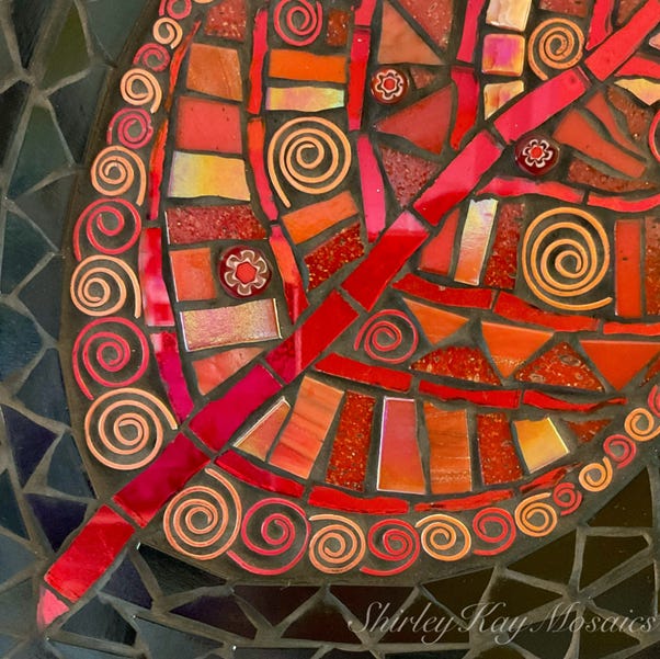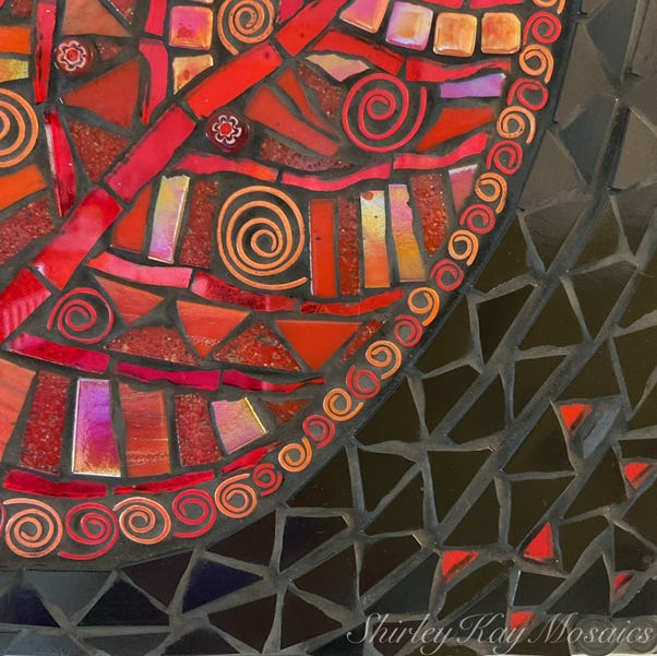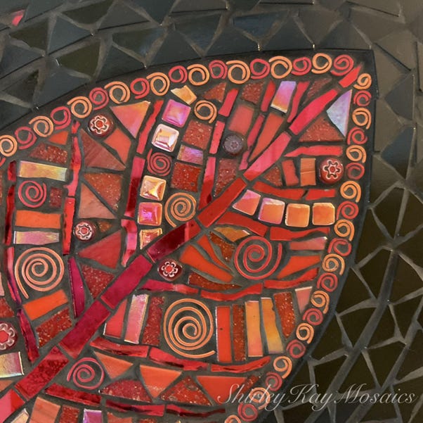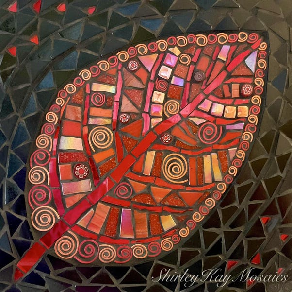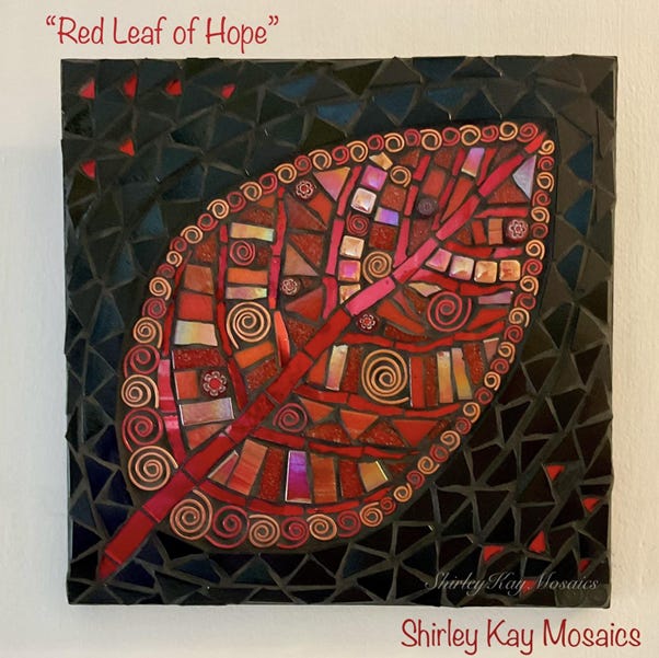 This “Red Leaf of Hope” mosaic incorporates fragments of mirror, vitreous glass, iridescent glass, textured glass, millefiori, hand-shaped wire, with a contrasting black glass tile background and black grout.