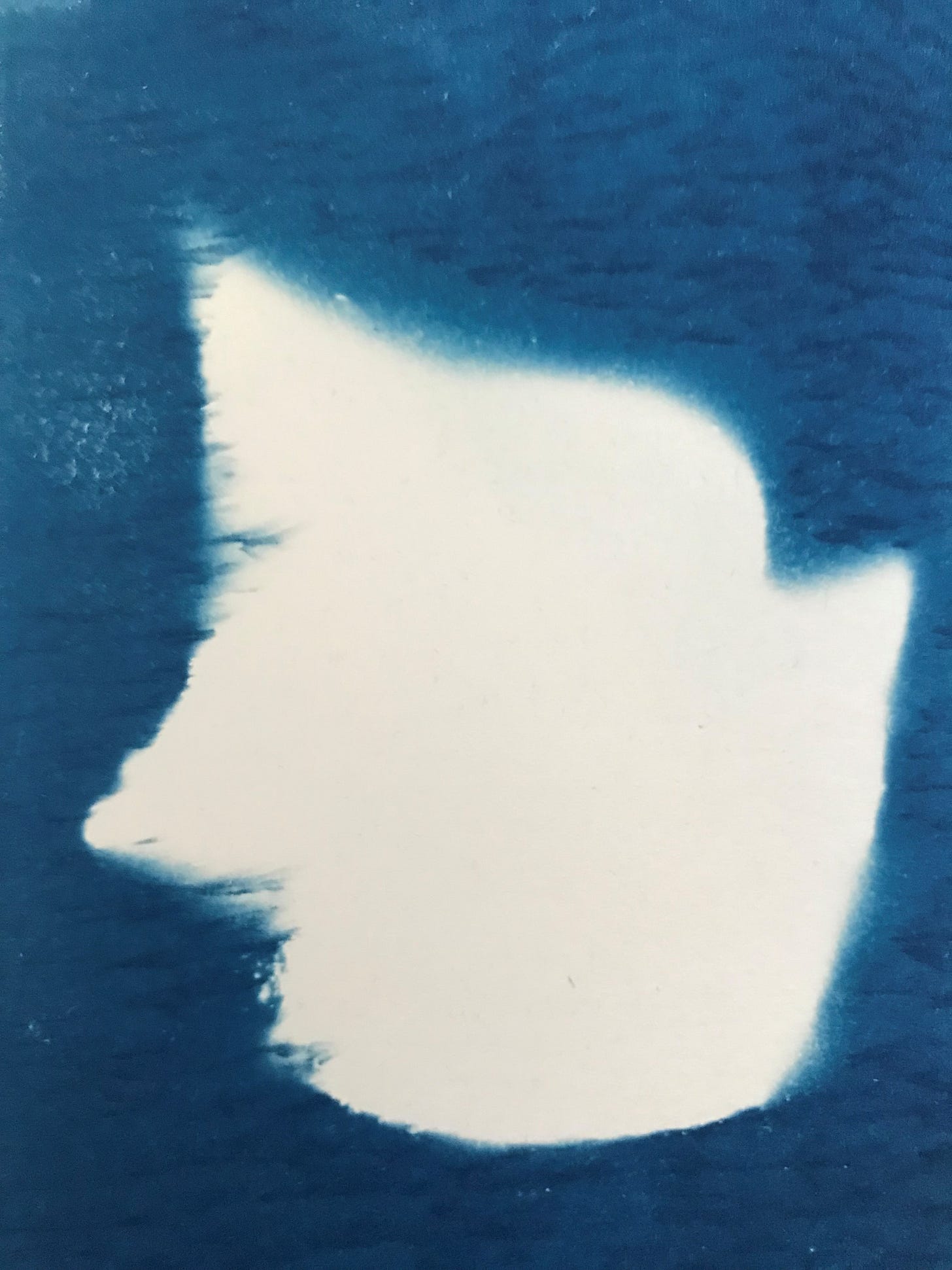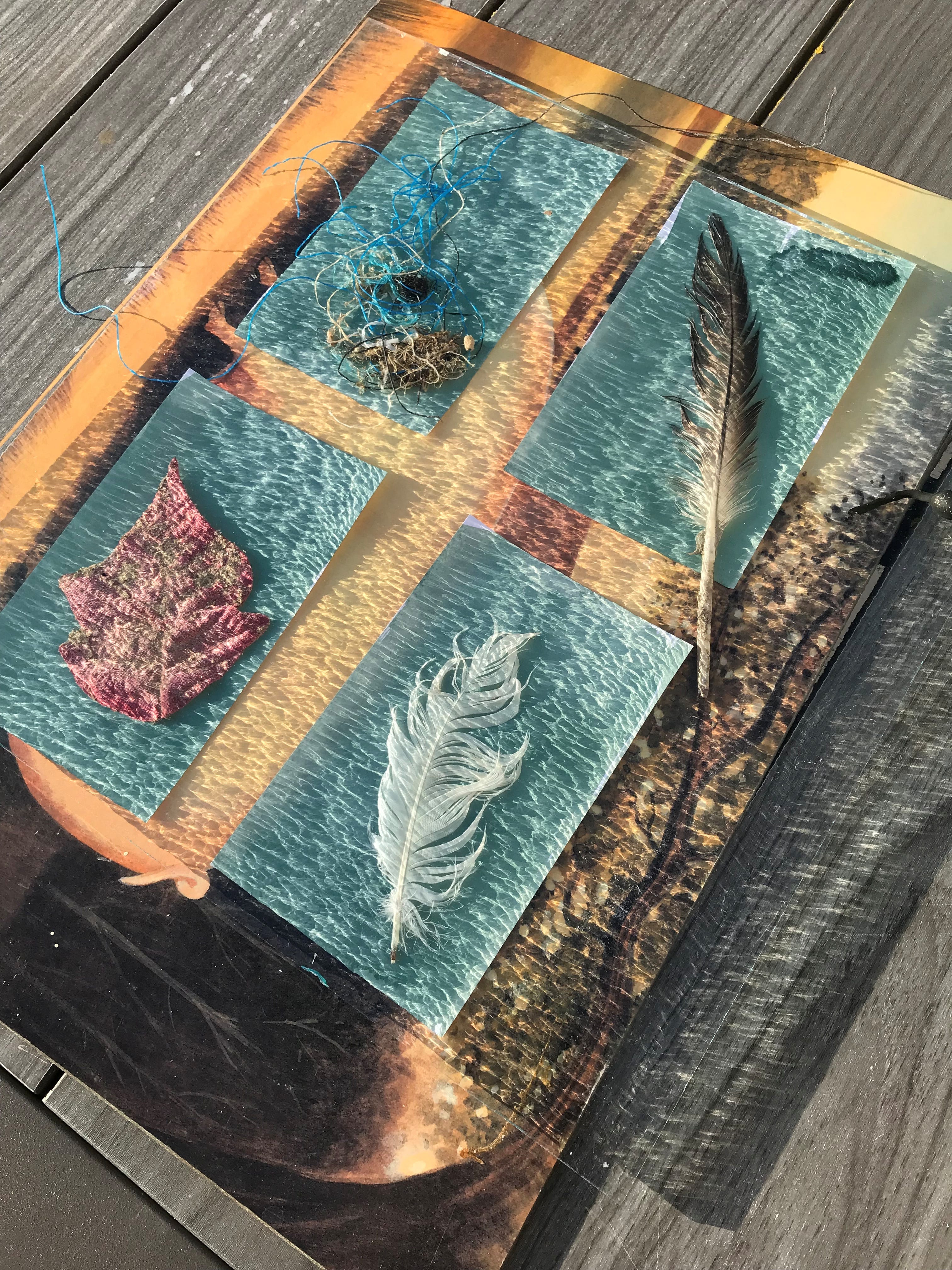 Quite quickly I had an echo of the plastic red leaf marked out in white, surrounded by blue as the paper reacted to being outside in the sun. Natural objects, like feathers and plants, if you leave them long enough in sufficiently strong sunlight, begin to create x-rays – you can start to see veining and detail within the objects. The leaf being plastic, will only ever give an outline of its shape with this method. I was initially a bit disappointed by that, it isn’t an especially interesting image compared to some of the others I made that day. The more I’ve thought about it though, the more it feels all the more pertinent – the absence is clear, to only see an outline of the shape seems an especially meaningful translation of ME/CFS. The object is missing from its own image and the leaf has transformed from red to blue.