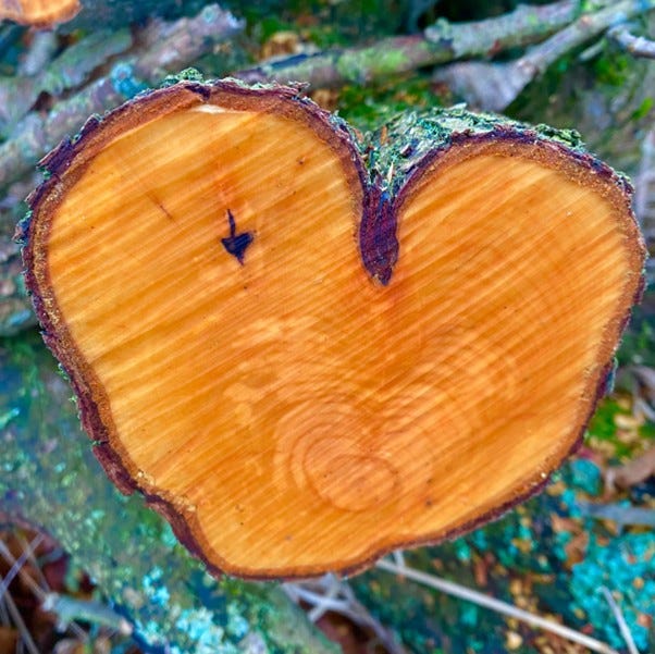 As I looked more closely at the heart shaped single branch, I noticed that its outer bark was grey and green, rough, and cracked. In contrast, the inner sapwood and heartwood appeared warm and glowing, strong, and complex with intricate patterns. Just like my son with M.E., whose body may be failing, but inside he is still the strong, amazing individual he has always been, more extraordinary and with more wisdom because of his illness experience.