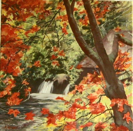 The stunning piece, Autumn Burn, kindly shared by Anita was painted long ago, and almost forgotten. Its re emergence now feels like its own kind of red leaf: a tiny glimmer of hope, a reminder that even what has been hidden can still offer warmth, beauty, and connection when brought back into the light.